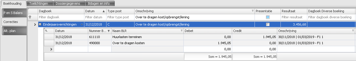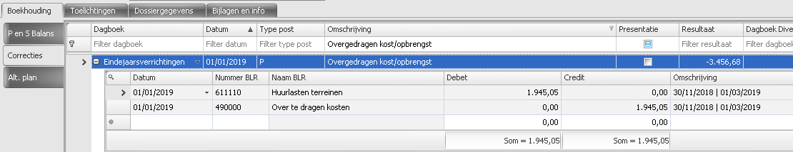 De toelichting van de rekeningen m.b.t. de over te dragen kosten & opbrengsten (rek.490 en 493) bevat vanaf versie 1.45.0 ook het beginsaldo van de overdracht van vorige jaar.