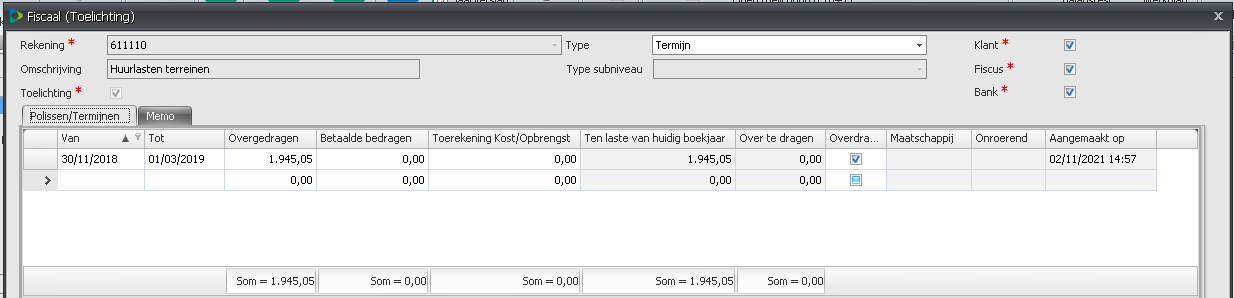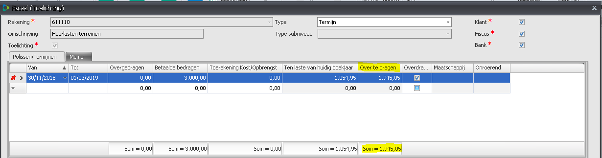 - Termijn : gebruikt voor alle niet-voertuig kosten/opbrengsten