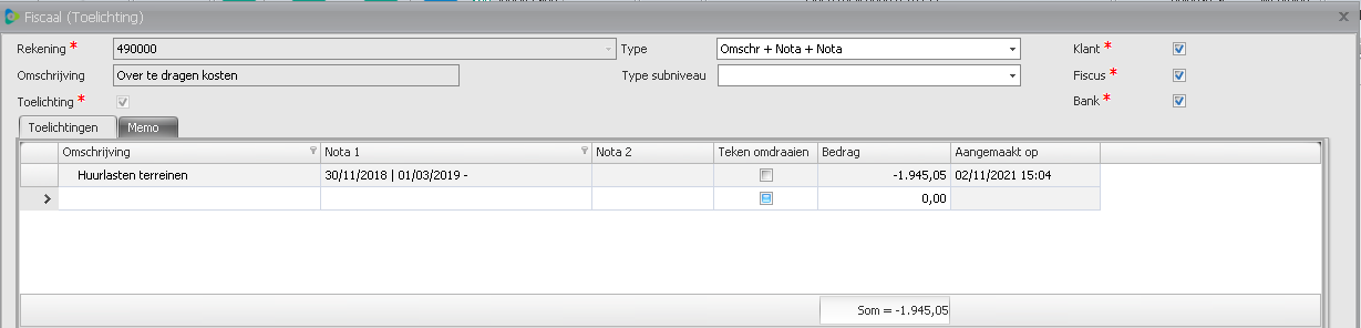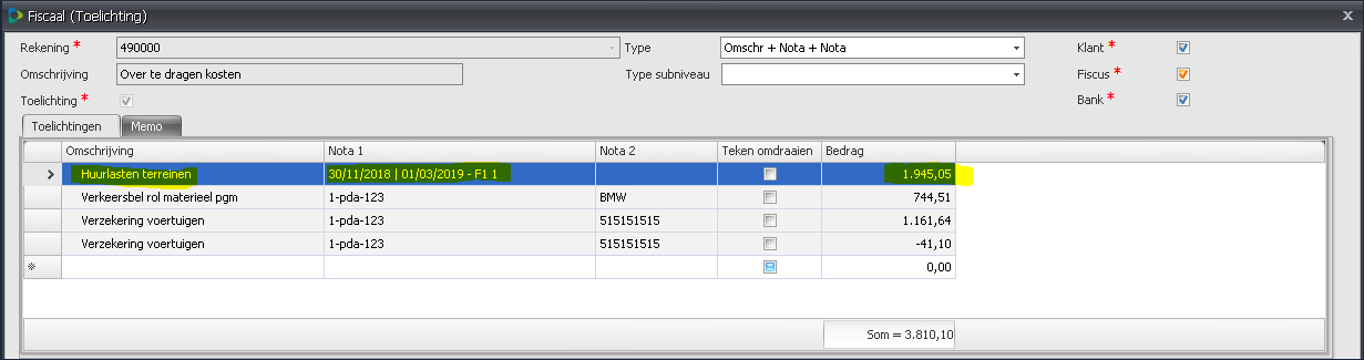 OpgeletDe optie “Grootboek naar toelichting” (zie gele markering op print-screen) mag niet gebruikt worden voor de 49 rekeningen (490/491/492/493) wanneer gebruik wordt gemaakt van het over te dragen en/of toe te rekenen kosten/opbrengsten systeem uit het Fiscaal Dossier.
