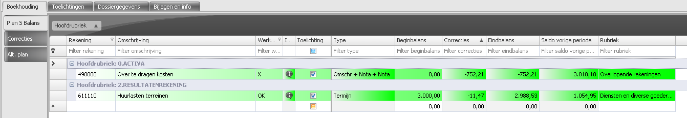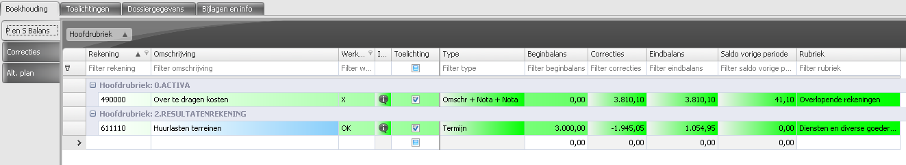 - In de balans zien we ook dat deze 2 rekening correct zijn toegelicht (groene kleur)