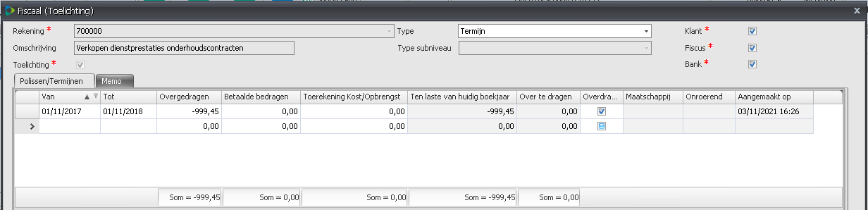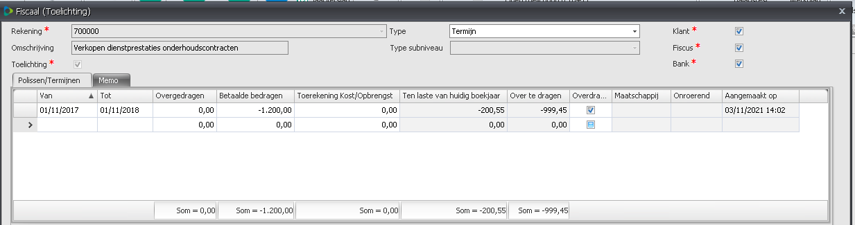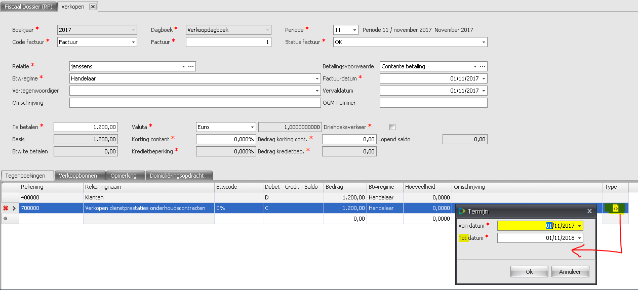 Voorbeeld De onderneming stelt een contract op voor het onderhoud van machines (1.200 €) en int op 1 /11/2017 de bedragen voor 12 maanden dienstverlening, waarvan de laatste vier maanden in het volgende boekjaar zitten