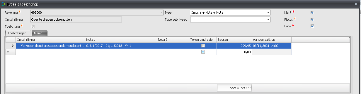 - Bij de tegenboeking (490.XXX rekening) ) krijgen we de volgende details in de toelichting