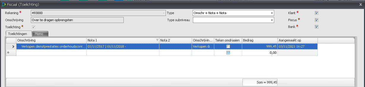 - Bij de tegenboeking (493.XXX rekening) ) krijgen we de volgende details in de toelichting