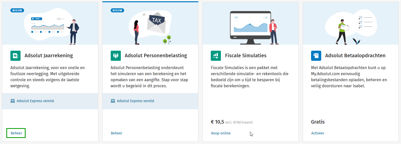 - Op de tegel van Adsolut Jaarrekening klik je op Beheer