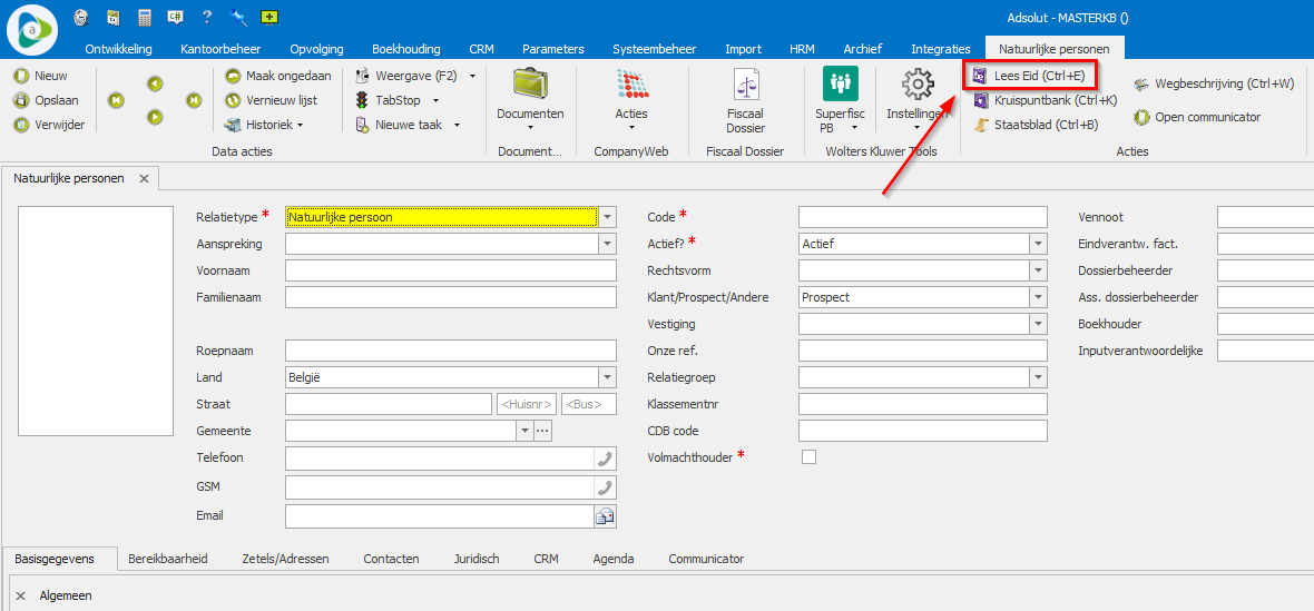 - Ga bovenaan naar Acties en klik op Lees eID of gebruik de toetsencombinatie Ctrl+E