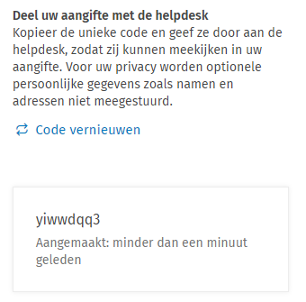 - Vervolgens kun je via de link Hulp nodig? (rechts bovenaan) de aangifte delen met de helpdesk door een code aan te maken.