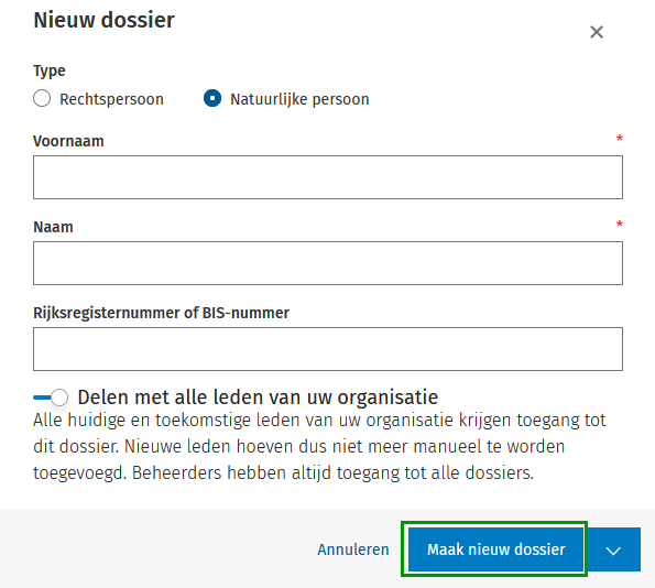 - In het volgende scherm vul je vervolgens de naam van de natuurlijke persoon en het rijksregisternummer in. Nadien klik je op Maak nieuw dossier.