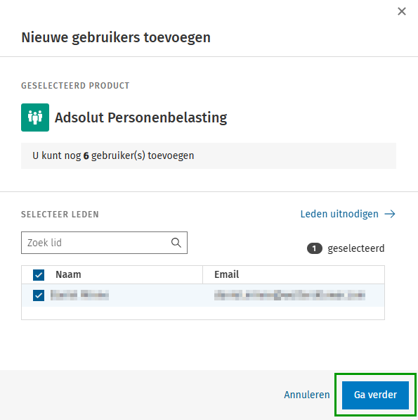 - Je selecteert de gebruiker en klikt onderaan op Ga verder.