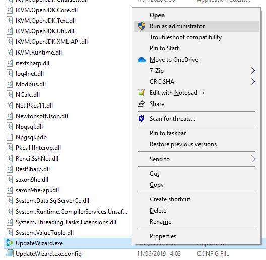 In deze map start je het bestand UpdateWizard.exe (met behulp van de rechtermuisknop) op als Administrator.