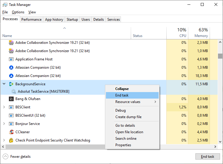 Start het taakbeheer van uw computer en beëindig de achtergrondprocessen Backgroundservice en Sync service.