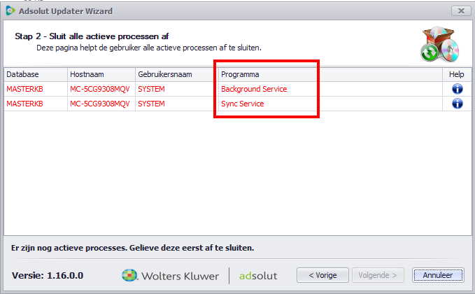 Sluit Adsolut/actieve processen af. Klik op Volgende om verder te gaan.