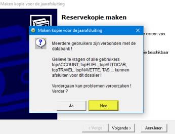 Dit betekent dat wanneer u met TAS, topFUEL, topTRAVEL of topAUTOCAR werkt, dat u ook daar het dossier moet verlaten. Slechts één persoon mag in het dossier ingelogd zijn, namelijk de persoon die de reservekopie maakt.
