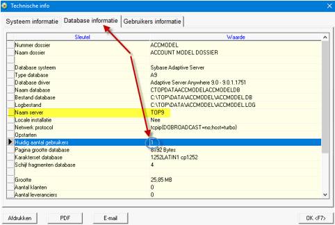 Wanneer topACCOUNT blijft melden dat er een gebruiker ingelogd is in het af te sluiten dossier, vraag dan aan uw hardwareleverancier of systeembeheerder om de service Adaptive Server Anywhere TOP9 of SQL Anywhere TOP16  te stoppen en te herstarten. In het geval van TAS zal de naam van de service gewoon SQL Anywhere TOP (Sybase 16) of Adaptive Server Anywhere TOP (Sybase 9) zijn.
