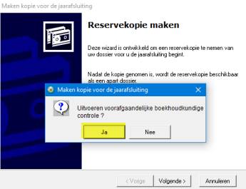 Ga naar het dossier waarvan u het boekjaar wil afsluiten en ga naar het menu periodiek > eindejaarsverwerking > reservekopie