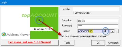 Start topAccount op. Log in met uw gebruikelijke gebruiker en paswoord (standaard: gebruiker DEMO, paswoord DEMO) en selecteer het dossier waarvan u een reservekopie moet maken. Kies OK