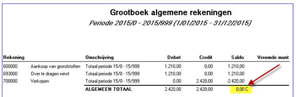 Het saldo moet op 0,00 staan. Met andere woorden, het resultaat (winst of verlies) voor het af te sluiten boekjaar is weggeboekt. Het boekjaar mag nu afgesloten worden.