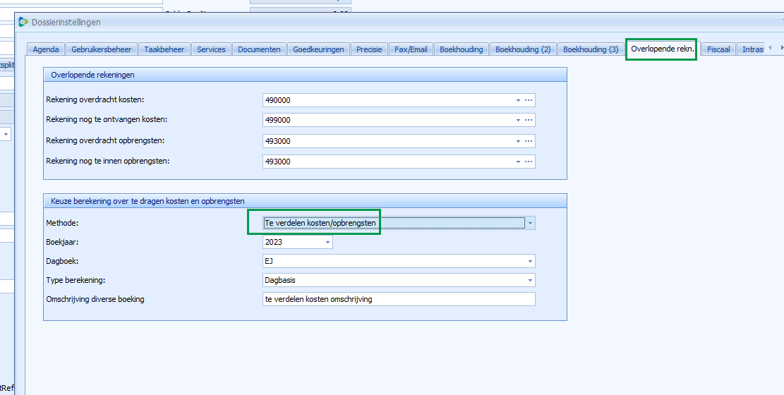 Bent u al reeds overgeschakeld naar methode 'fiscaal dossier', dan gaat u terug naar 'systeembeheer/dossierinstellingen/overlopende rekeningen', zet u tijdelijk de methode op 'te verdelen kosten/opbrengsten'.