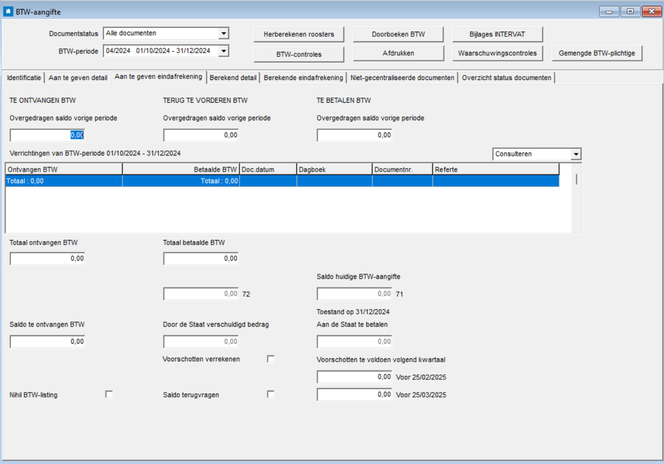 Dit totaal wordt verrekend met het saldo van de huidige btw-aangifte en resulteert in een nog aan of door de Staat verschuldigd bedrag.