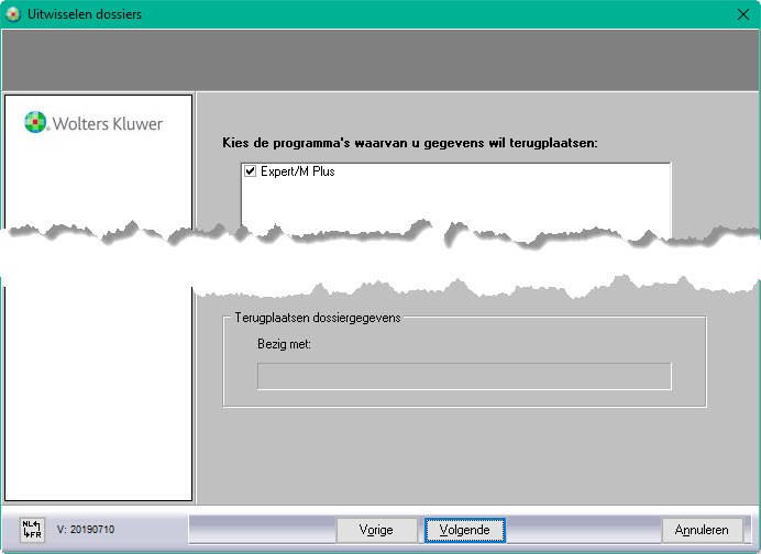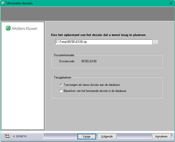 U kan alleen dossiers terugplaatsen en/of openen indien uw programmaversies gelijk of hoger zijn dan die van de aangeleverde bestanden.