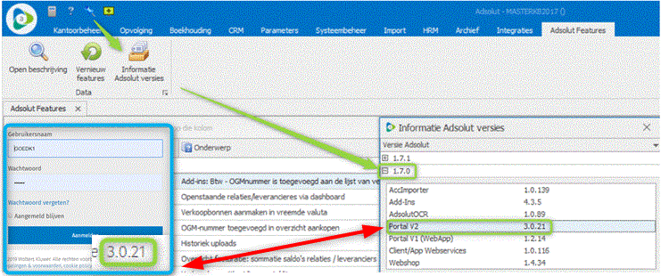 - Versie van Adsolut en versie van het portaal (zie onderaan hoe u dit te weten komt)