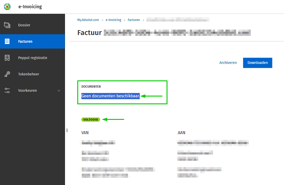 Indien er geen PDF van de factuur in de XML opgenomen werd, zal u in de detailweergave van de factuur zien dat er geen documenten beschikbaar zijn.