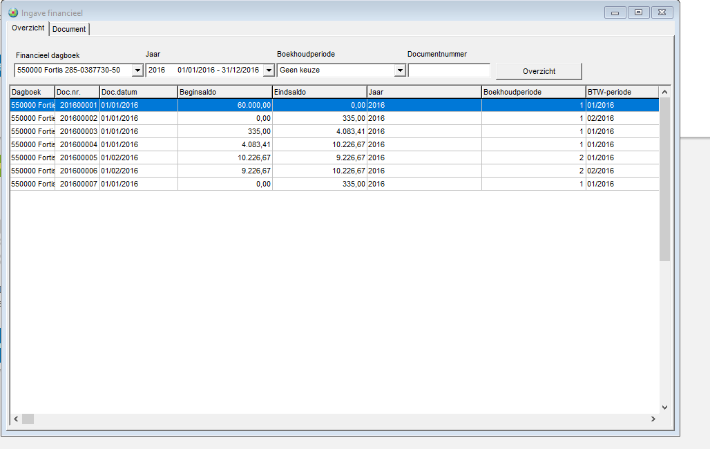 1) Ga naar "Dagboeken" > "Financieel" > "Ingave financieel" > "Overzicht"