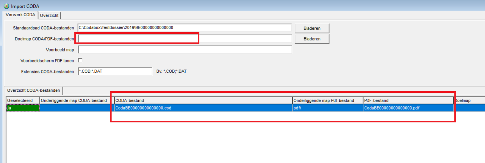 - De te verwerken CODA-bestanden worden opgeslagen in de folders "C:\Codabox\Testdossier\2019\BE00000000000000" en "C:\Codabox\Testdossier\2019\BE11111111111111".