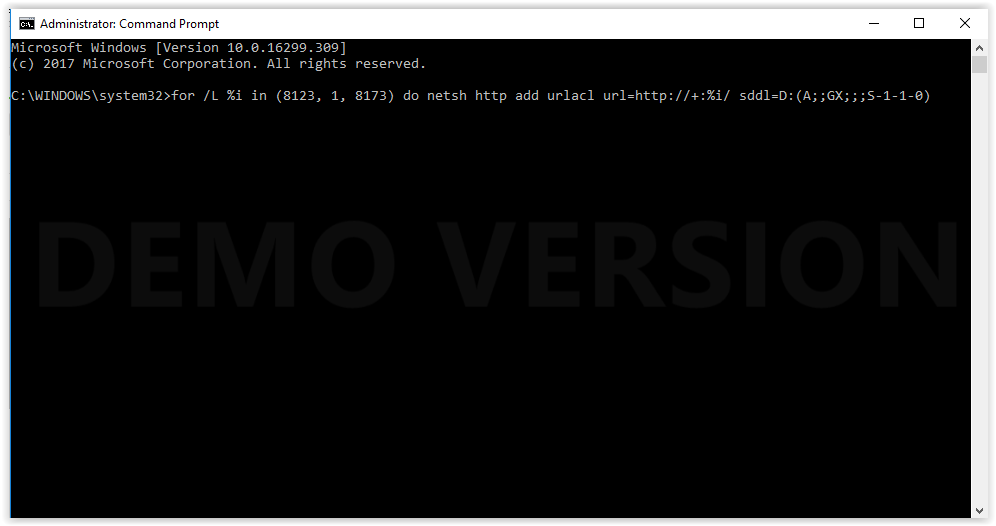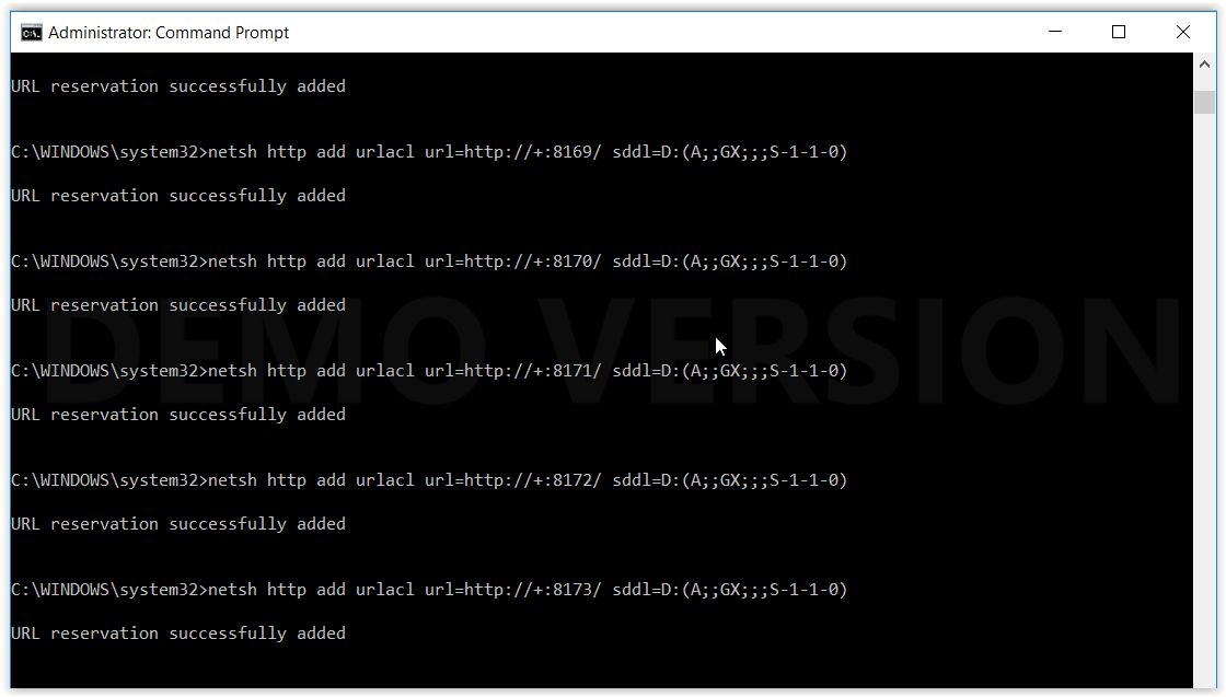 - Voer het volgende uit: for /L %i in (8123, 1, 8173) do netsh http add urlacl url=http://+:%i/ sddl=D:(A;;GX;;;S-1-1-0)