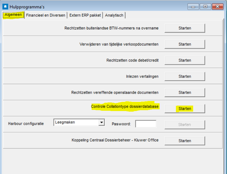 - Klik in het tabblad 'Algemeen' op de knop 'Starten' bij de optie 'Controle Collationtype dossierdatabase'. (U zal merken dat er niets lijkt te gebeuren, maar achterliggend wordt deze controle/aanpassing uitgevoerd. Na een aantal seconden kan u het venster terug sluiten)