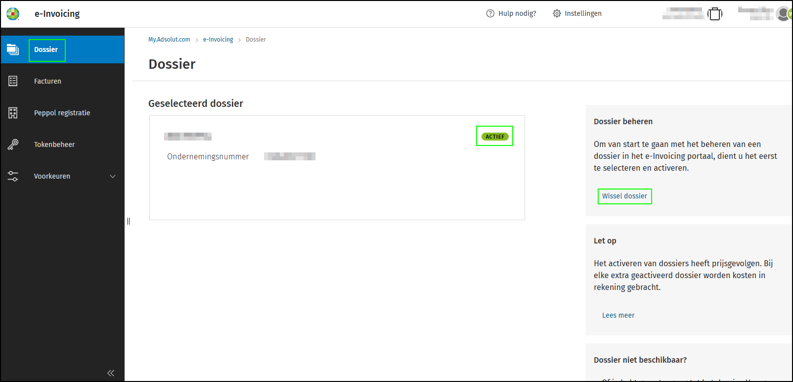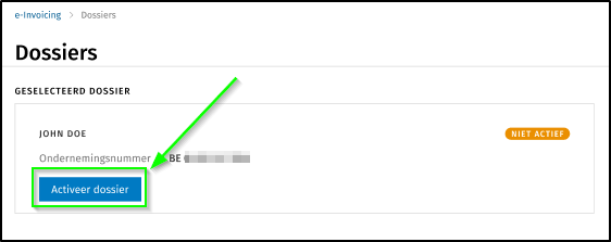 Let op, een toegevoegd dossier wordt NIET automatisch geactiveerd voor gebruik op het e-Invoicing portaal.