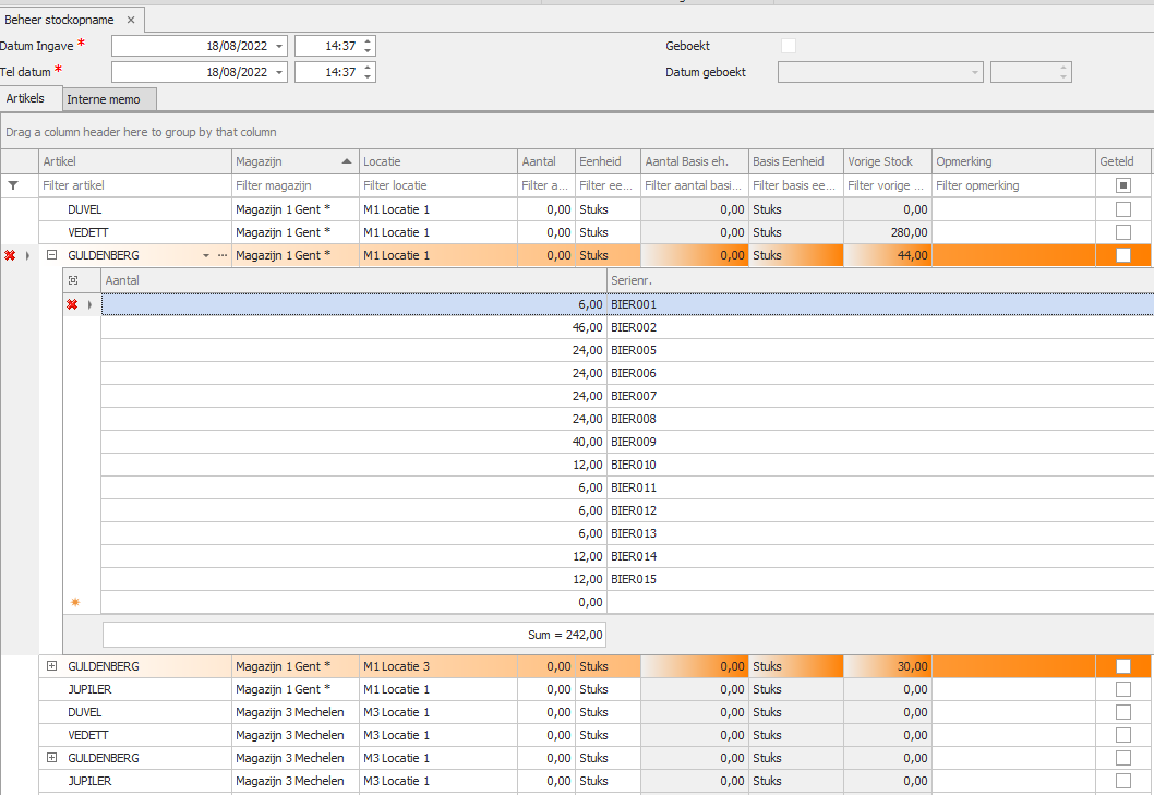 - Door zelf artikels, magazijn, (eventueel) locatie, toe te voegen, en dan de getelde stock in te geven