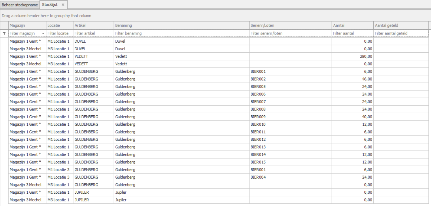 Op dit overzicht kan u kolommen toevoegen of wegdoen, u hebt dus een andere lay-out dan het overzicht van Beheer Stockopname zodat u hier enkel deze info kan printen die belangrijk is om het tellen gemakkelijk te maken.