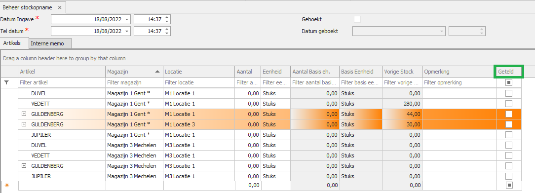 Wanneer de instelling STOCKOPN_GETELD de waarde True heeft dan kan de stockcorrectie pas geboekt worden als voor alle lijnen het veld Geteld aangevinkt is.