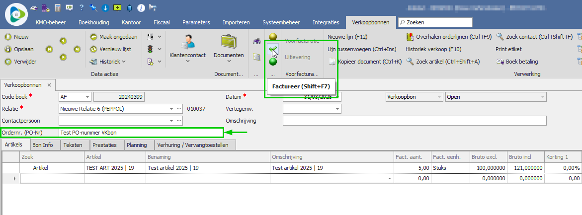 Wanneer je een verkoopbon opmaakt met de bedoeling deze via Peppol te verzenden, is het belangrijk dat er een PO-nummer in de XML wordt opgenomen. Zonder PO-nummer zal de XML van de factuur niet gevalideerd kunnen worden en zal de factuur op het portaal de status Geweigerd krijgen.