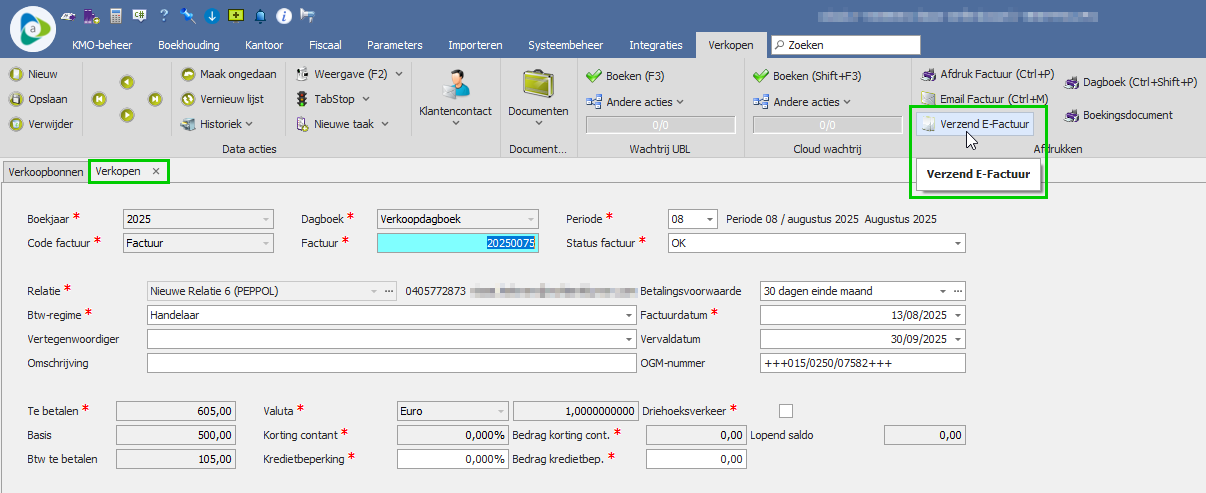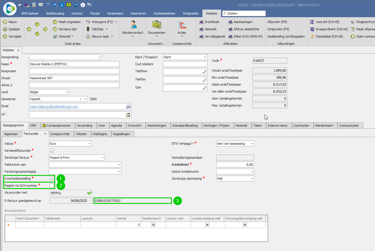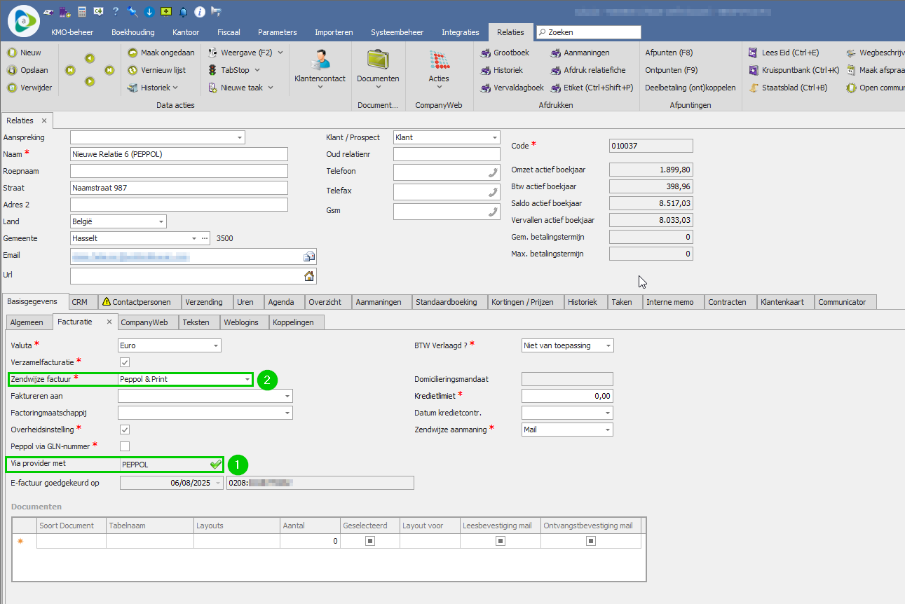 - Als de relatie geregistreerd is, zal het veld opgevuld worden met PEPPOL.
