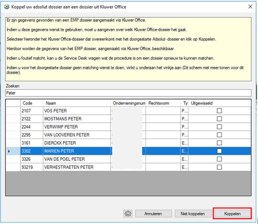 - indien meerdere zoekresultaten, selecteer de gewenste relatie.