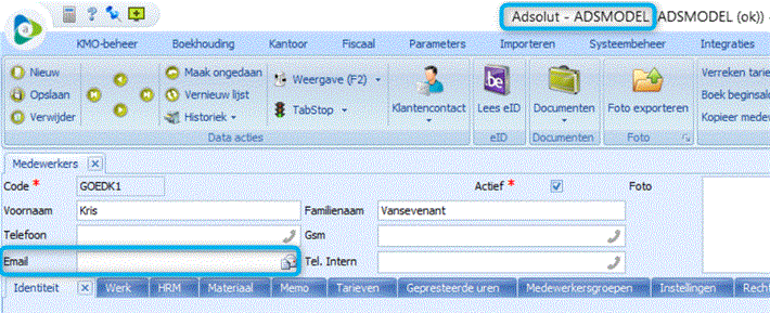 - zoekt Adsolut (in het masterkb) naar de medewerker met een code gelijk aan de aangelogde systeemgebruiker.