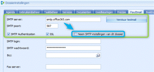 Instellingen in het subdossier, systeembeheer, dossier settings, fax/email. Deze instellingen zijn in principe overgenomen vanuit het MasterKB, daarom staat hieronder geen vinkje bij