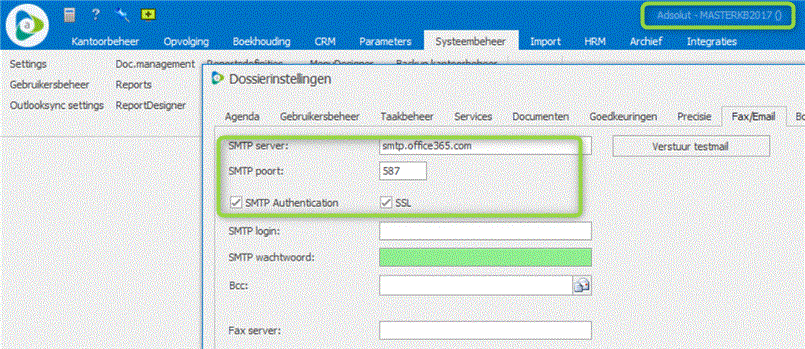 Masterkb van de e-mailsettings via systeembeheer, settings (merk op: in het subdossier moet je dus deze settings ook aantreffen).