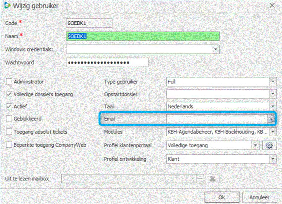 In het MasterKB, Systeembeheer, gebruikersbeheer hoef je géén e-mailadres in te stellen.