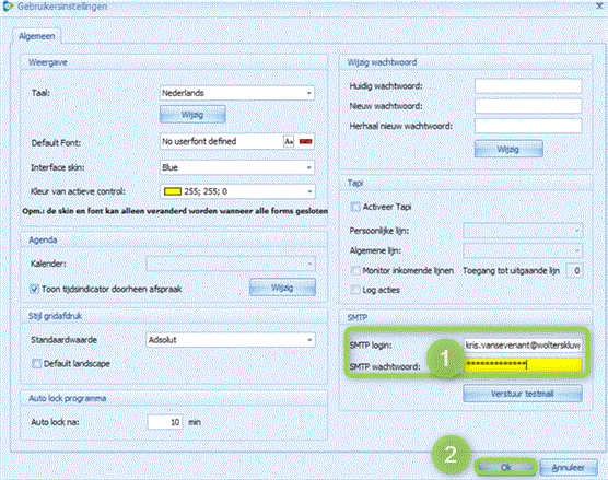 Vul de smtp settings, login en wachtwoord, in en druk op Ok. Druk nog niet op verstuur testmail, want de smtp gegevens zijn nog niet weggeschreven in Adsolut!