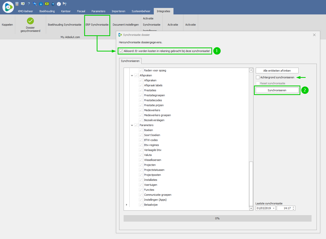 - Dossier synchronisatie wordt opgestart. Bevestig voor akkoord door het hokje aan te vinken en klik rechts op de knop Start synchronisatie.