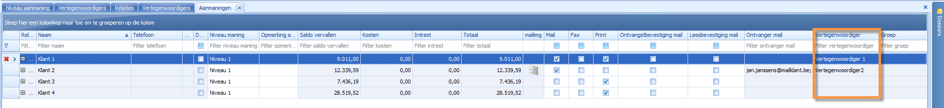 Bij het genereren van de aanmaningen zal per relatie de vertegenwoordiger opgehaald worden. Dit is duidelijk weergegeven in het overzicht: U merkt dat in het voorbeeld hierboven, voor Klant 1, de vink in de kolom ‘mail’ is aangevinkt en dat er geen ‘mailafbeelding’ zichtbaar is, terwijl dit voor klant 2 wel het geval is. Dit komt omdat de ‘Zendwijze aanmaning’ (zie relatiefiche – facturatiegegevens) op ‘Print’ staat. Omdat u wel een kopie van de aanmaning wenst te mailen naar de vertegenwoordiger, staat er ook een vink in de kolom ‘mail’ Klant 1 zal zelf dus een geprinte aanmaning ontvangen en zijn vertegenwoordiger zal per mail de aanmaning ontvangen. Voor klant 2 staat de ‘Zendwijze aanmaning’ op ‘Mail’ en de contactpersoon is ingevuld in de relatiekaart, dus zowel de klant als de vertegenwoordiger, zullen de aanmaning per mail ontvangen. (Omdat de ‘ontvanger mail’ ingevuld is, is ook het mailicon zichtbaar, waarmee de preview van de mail kan getoond worden).