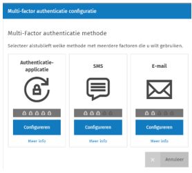 - Wil je MFA activeren? Klik op Configureer MFA. Je krijgt dan de beschikbare configuratieopties te zien, zoals hieronder weergegeven.