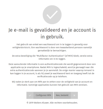 Bij het activeren van Multi-Factor Authenticatie (MFA) krijg je eerst een korte introductie en een overzicht van de voordelen. Als gebruiker heb je vervolgens de keuze om MFA in te schakelen of deze stap over te slaan.