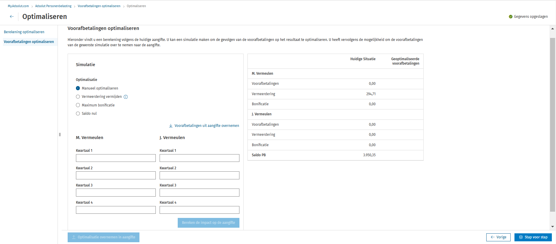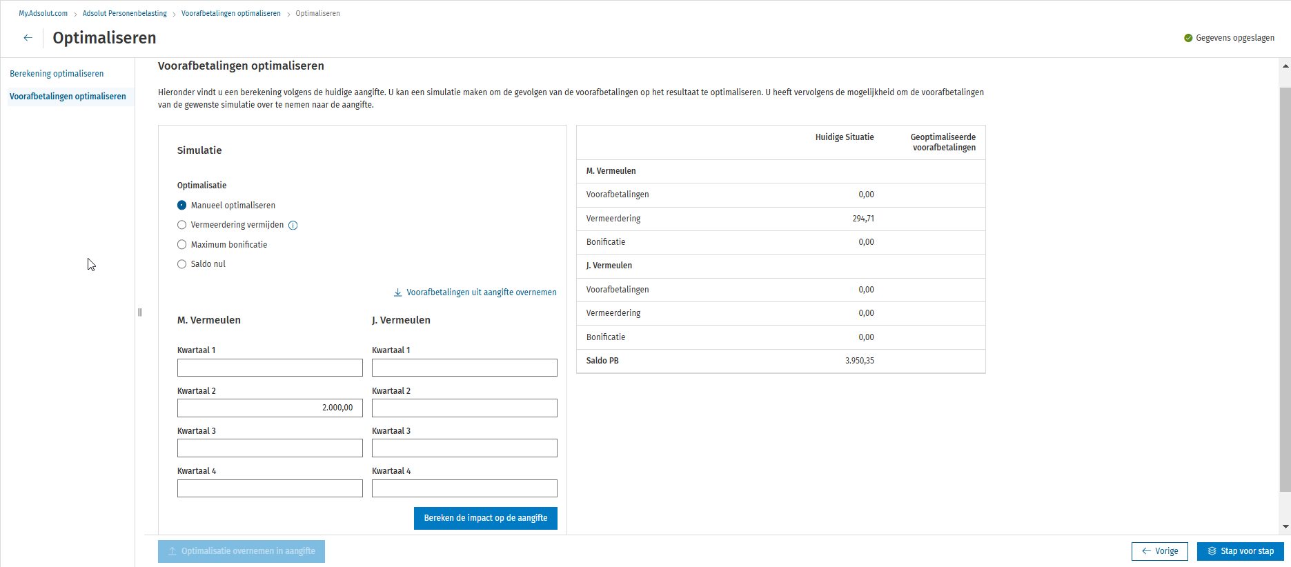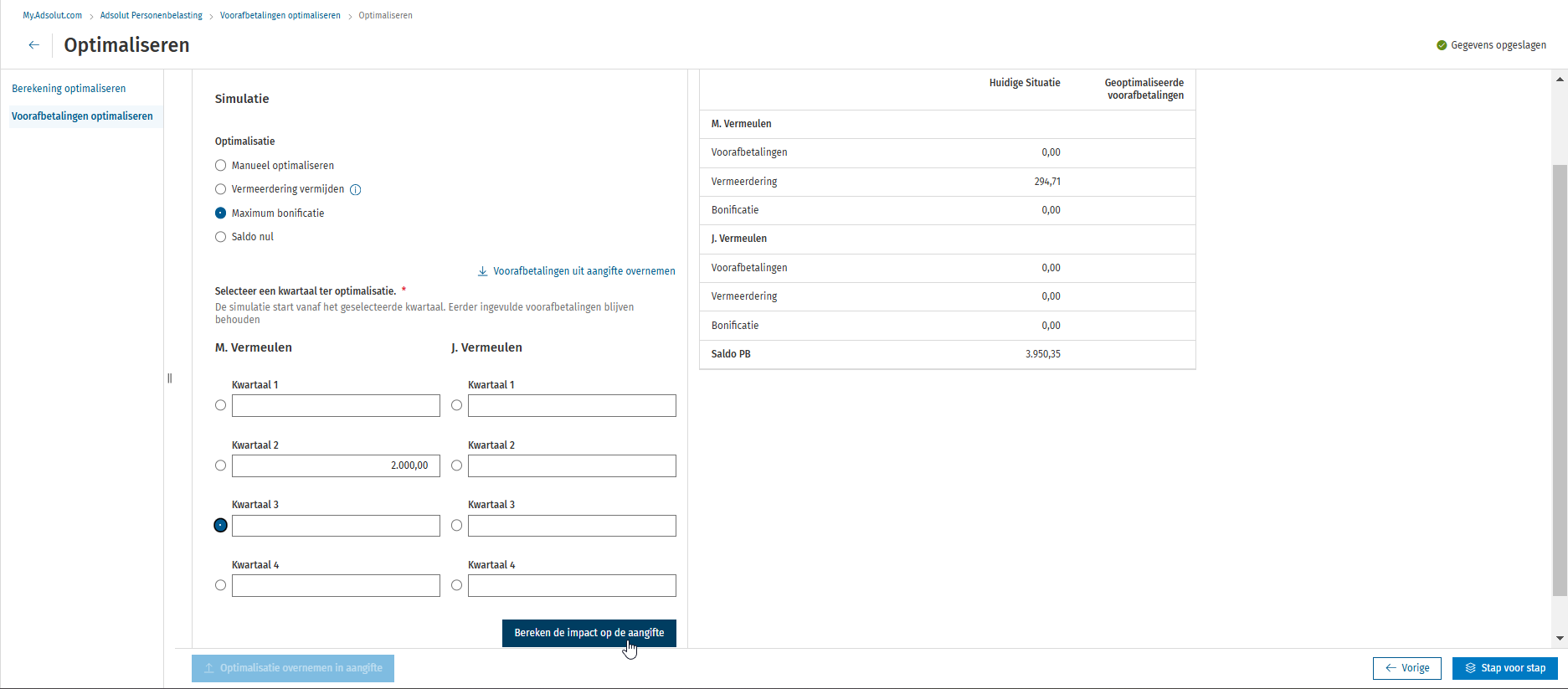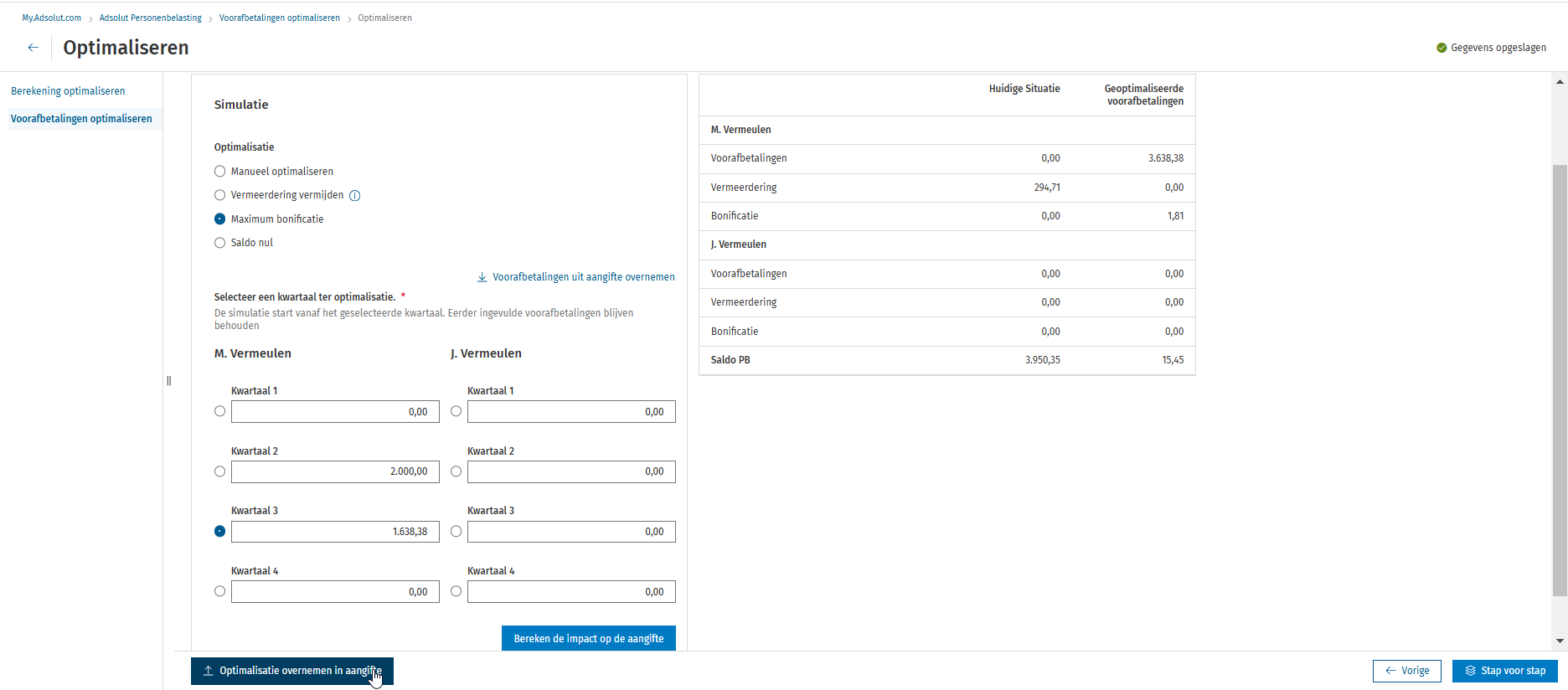 Na het rekenen wordt het geselecteerde kwartaal aangevuld met het optimale bedrag aan voorafbetalingen. In het rekenoverzicht vindt u ook een berekend resultaat volgens de “Geoptimaliseerde voorafbetalingen”. Zodra er gerekend is, kunt u onderaan de pagina de simulatie overnemen naar het hulpscherm “Voorafbetalingen” in de aangifte via ‘Optimalisatie overnemen in de aangifte’.