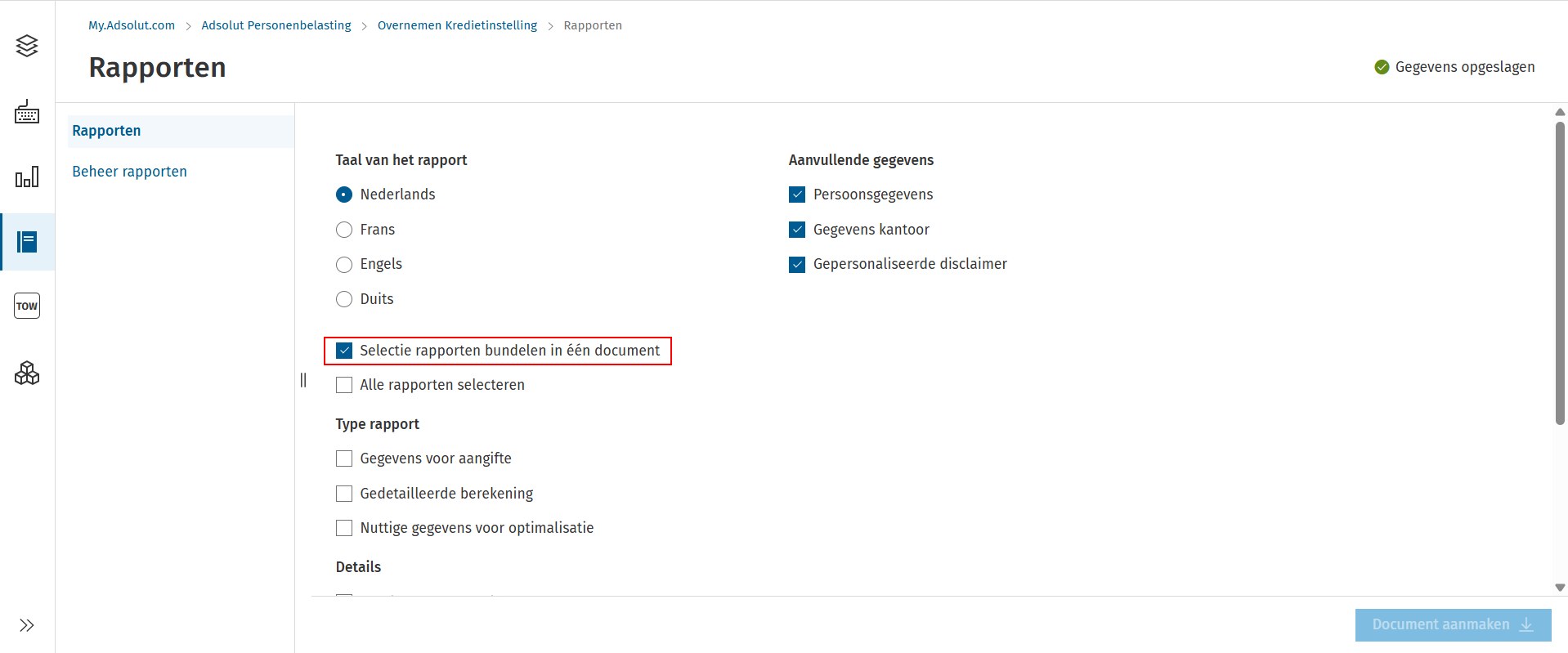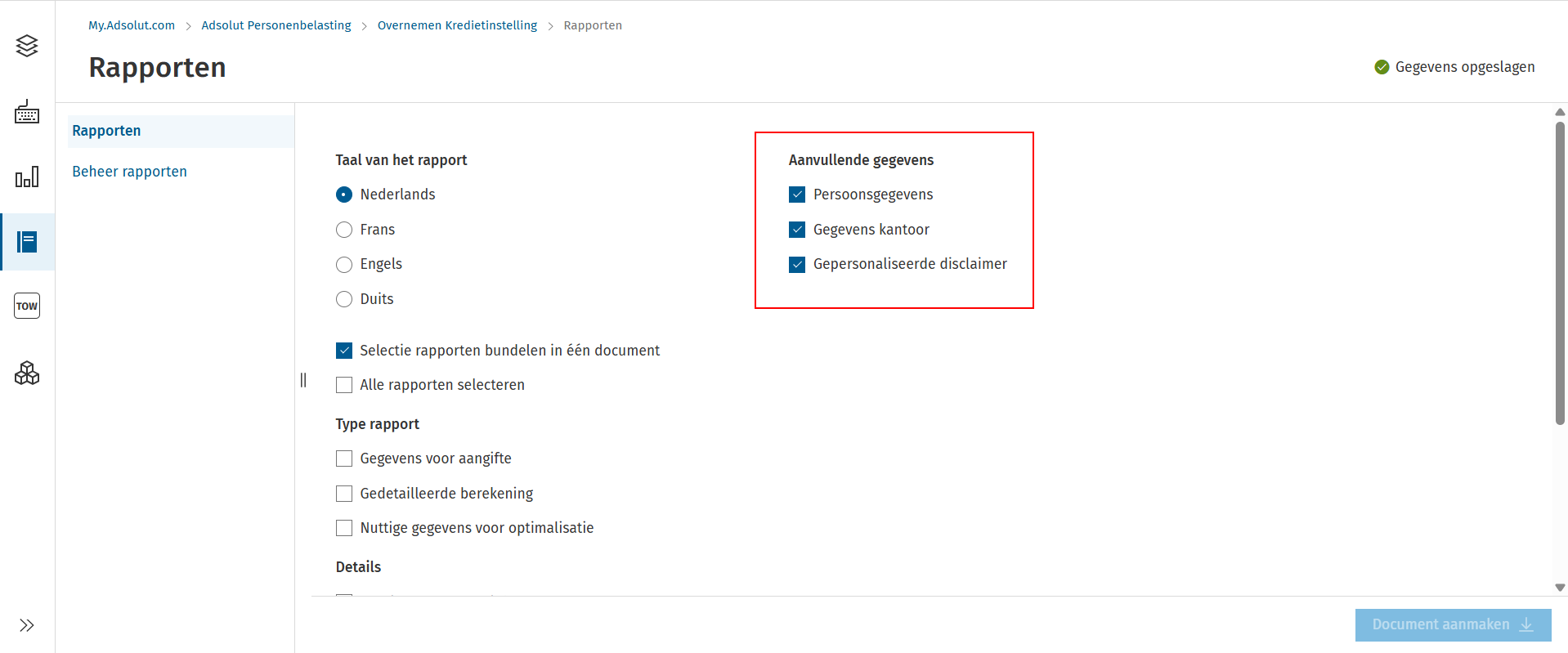 Afdruk personaliseren Het is mogelijk om alle afdrukken die via het hulpscherm 'Rapporten' gedownload kunnen worden, te personaliseren. Bij het aanmaken van een document kunt u kiezen welke aanvullende gegevens u wilt laten opnemen in de afdruk. Bovendien wordt uw laatste selectie in 'Aanvullende gegevens' opgeslagen, zodat u deze instellingen niet telkens opnieuw hoeft aan te vinken in een volgende sessie.