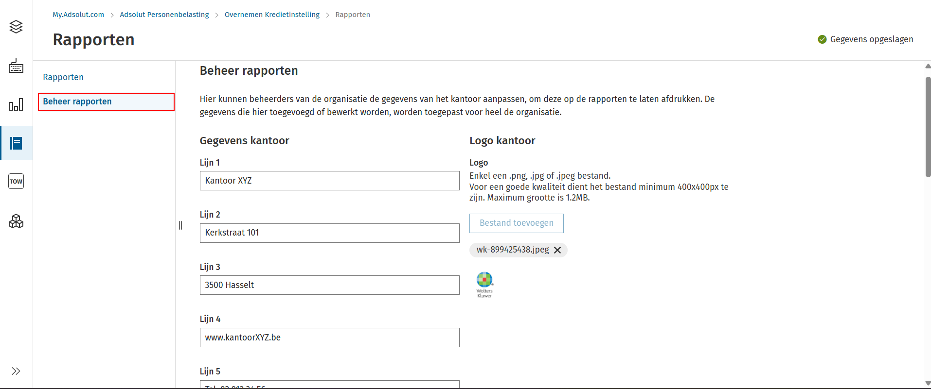 In het nieuwe hulpscherm 'Beheer rapporten' kunt u de gegevens met betrekking tot 'Gegevens kantoor' en 'Gepersonaliseerde disclaimer' toevoegen en beheren. Wijzigingen die u hier aanbrengt, zijn van toepassing op alle aangiften binnen uw organisatie. Op deze manier hoeft u deze gegevens slechts één keer aan te vullen en zijn ze beschikbaar voor alle aangiften. Om vergissingen te voorkomen, kunnen deze gegevens alleen worden bewerkt door beheerders van de organisatie.