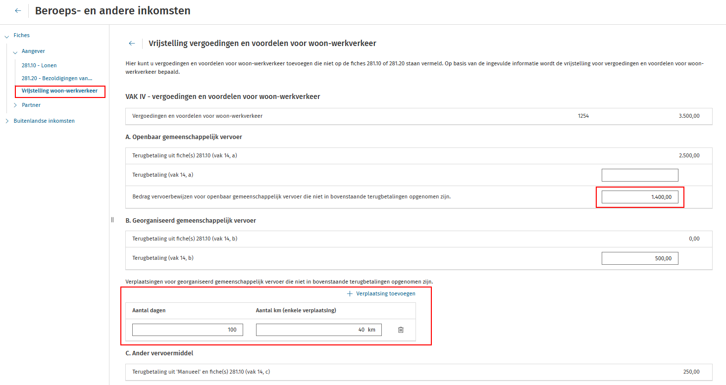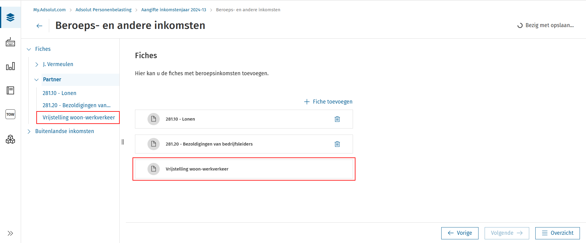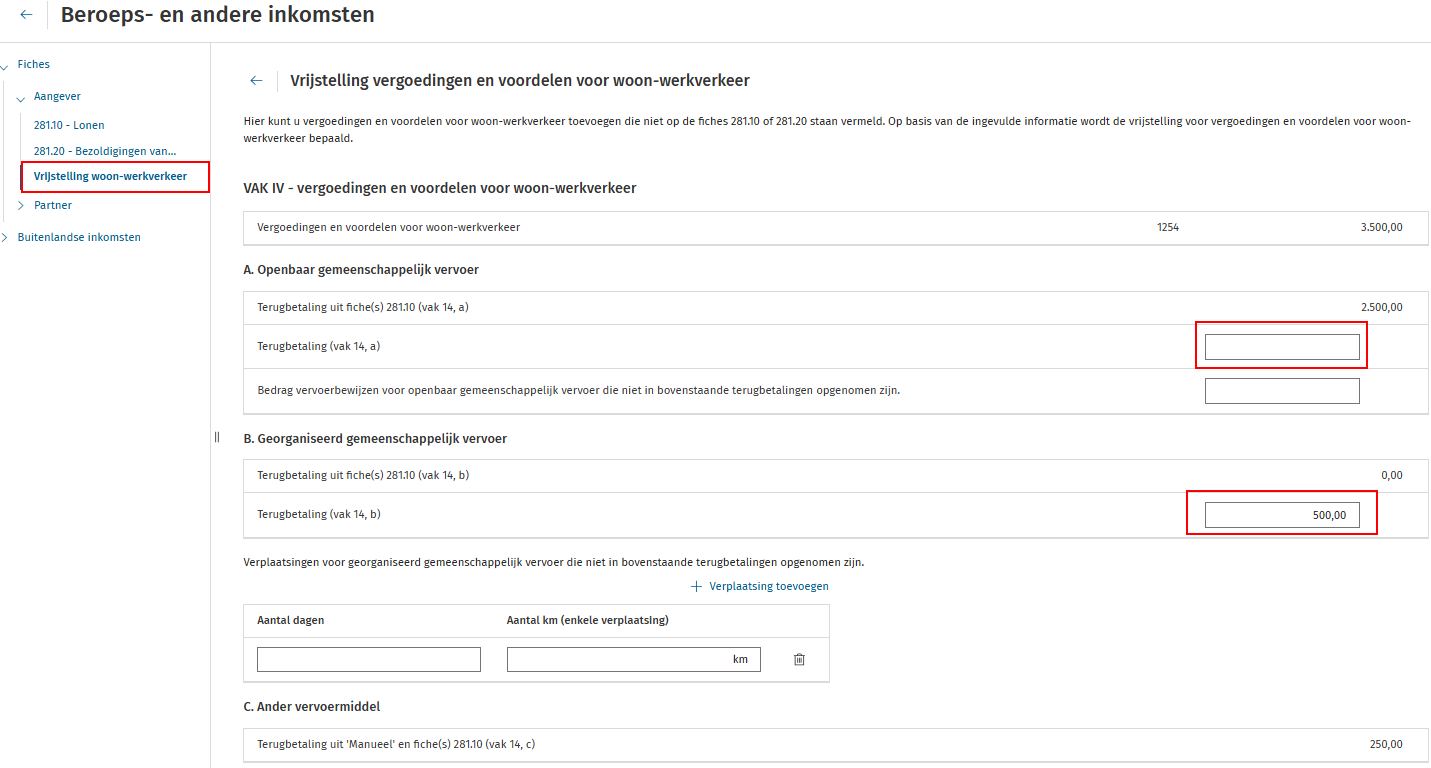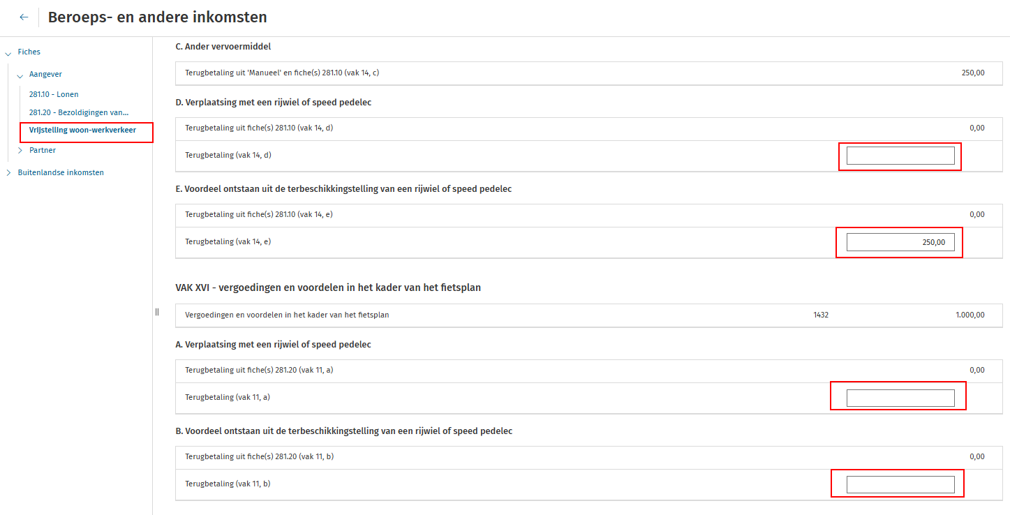 Vrijstelling van vergoedingen en voordelen voor woon-werkverkeer In het hulpscherm 'Beroeps- en andere inkomsten' > 'Fiches' > 'Vrijstelling van vergoedingen en voordelen voor woon-werkverkeer' kunt u voor zowel de aangever als de partner vergoedingen en voordelen voor het woon-werkverkeer toevoegen voor de vakken IV (wedden en lonen) en XVI (bezoldigingen bedrijfsleiders), die niet op de fiches 281.10 of 281.20 vermeld staan.