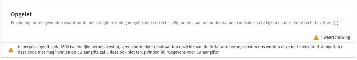 Optimalisatie forfaitaire en werkelijke beroepskosten in 'Gegevens voor de aangifte' Bij het gebruik van een code voor beroepskosten worden nu, naast de berekening, ook de in te vullen codes bij 'Gegevens voor de aangifte' geoptimaliseerd zodra de werkelijke beroepskosten geen voordeliger resultaat opleveren ten opzichte van de forfaitaire beroepskosten. In deze gevallen wordt de betreffende code beroepskosten verwijderd uit 'Gegevens voor de aangifte', zodat de in te vullen codes overeenstemmen met de gemaakte berekening. Om u hierop attent te maken in geval van een optimalisatie van de werkelijke beroepskosten, zijn er nieuwe boodschappen toegevoegd op 'Resultaat'.